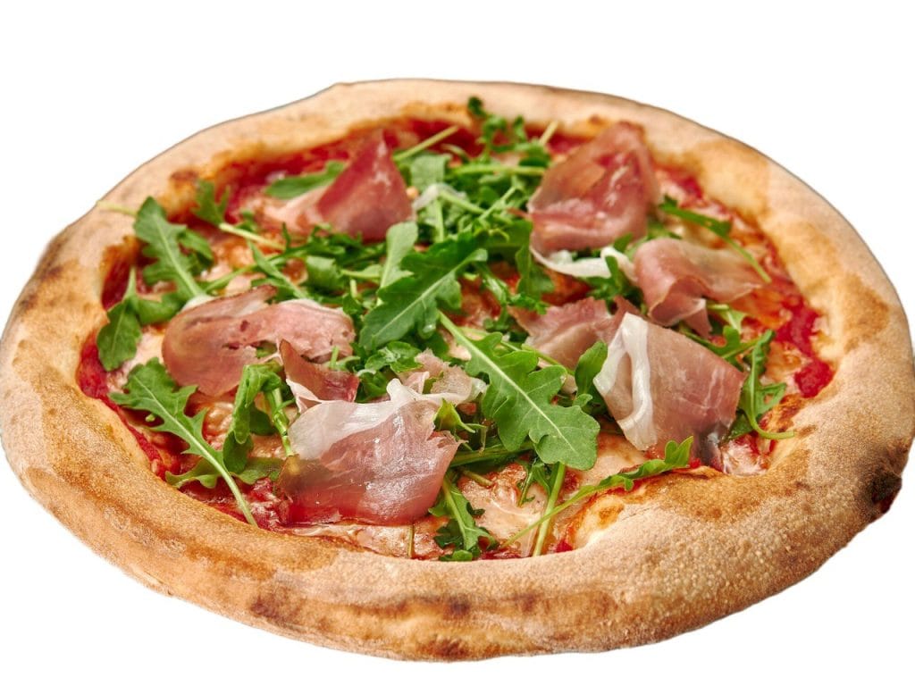 Томатная паста, сыр моцарелаа, ветчина, соус гриль, томаты черри, рукола, карамелизированный лук
