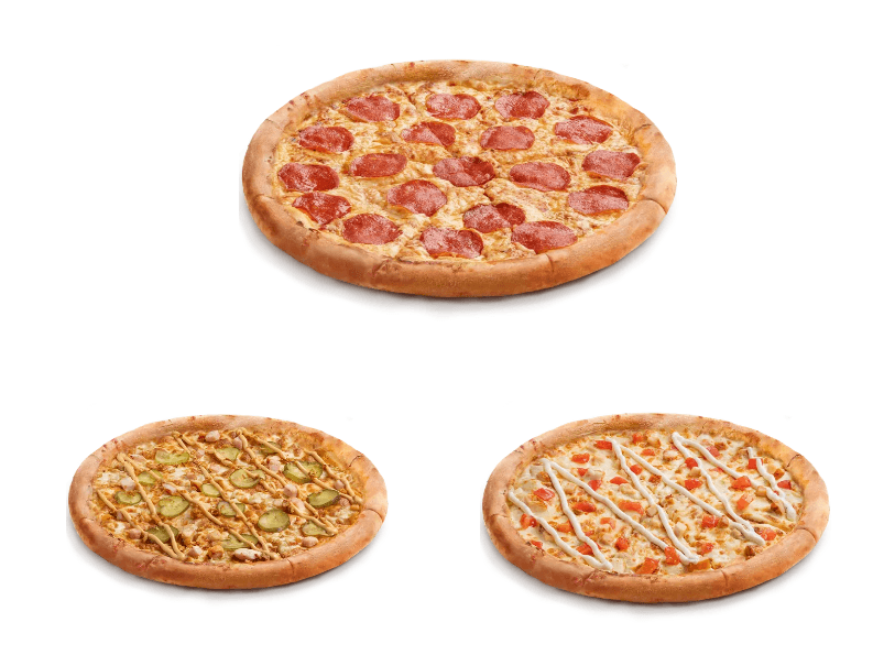 Сырный цыпленок (Томатная паста, сыр моцарелла, куриное филе, сырный соус, томаты) - 765г Бургер (Томатная паста, сыр моцарелла, корнишоны, ветчина, томаты, бургер соус) - 730г Пеперони (Томатная паста, пеперони, сыр моцарелла) - 540г